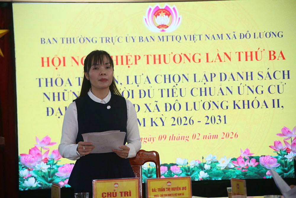 Chiều 9/2, Ủy ban MTTQ xã Đô Lương hội nghị hiệp thương lần thứ 3 thỏa thuận, lựa chọn, lập danh sách những người đủ tiêu chuẩn ứng cử đại biểu HĐND xã Đô Lương khóa 2, nhiệm kỳ 2026 – 2031. Chủ trì hội nghị có đồng chí Trần Thị Huyền Mơ – Ủy viên Ban Thường vụ Đảng ủy, Chủ tịch Ủy ban MTTQ xã.
